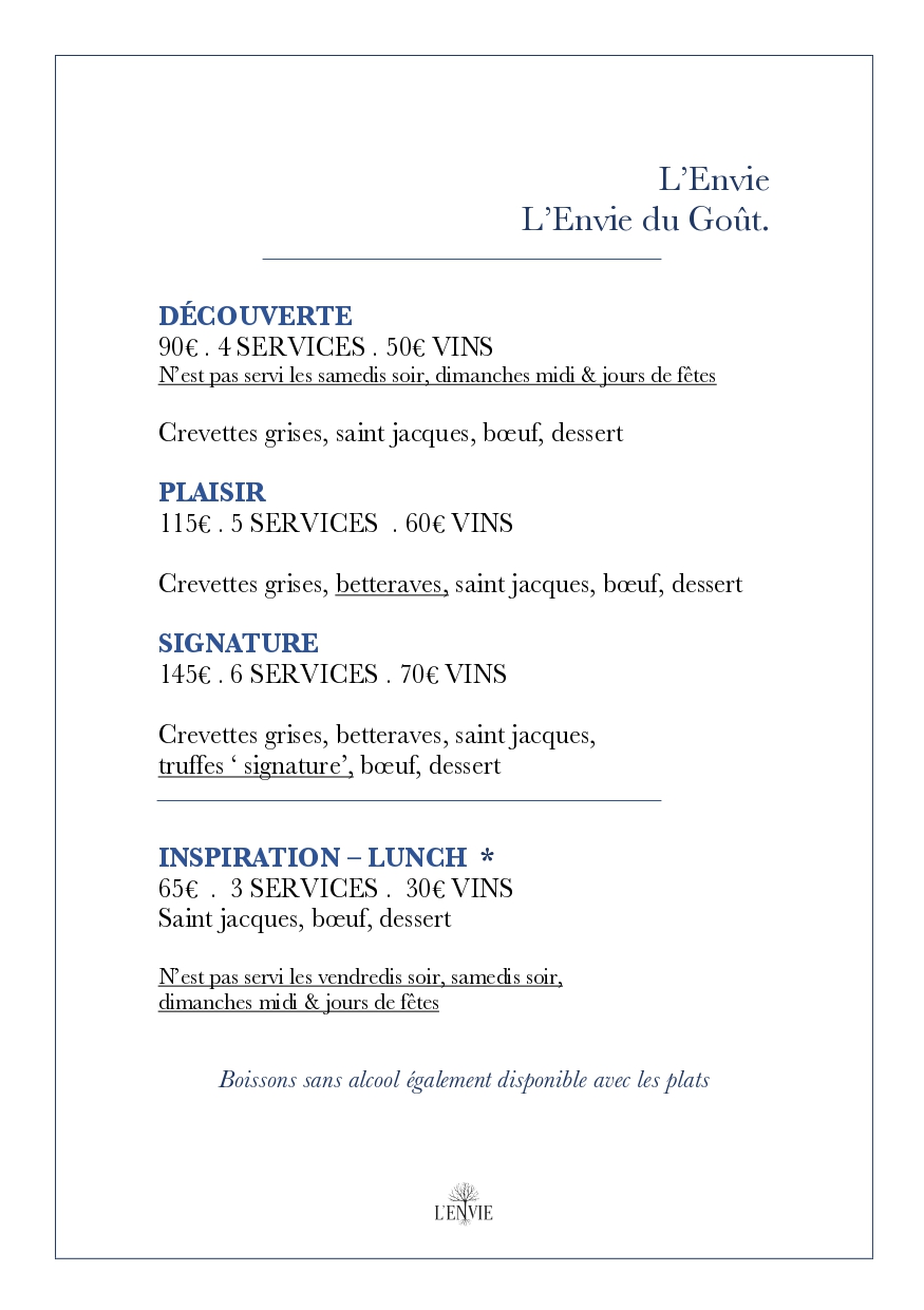 la carte n’est pas disponible le vendredi soir et samedi soir, à partir de 5 personnes nous servons que le menu L’Envie