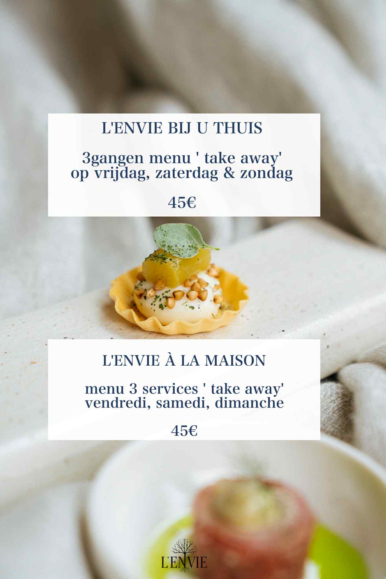 TAKE AWAY Menu Take Away @ Home 6/02 – 7/02 – 8/02 risotto van fregola sarda, parijse champignons, pastrami pluma iberico, witloof, rode wijn saus crème brulée van pistache, vanille ijs BOX VALENTINE ( 13/02 – 14/02 – 15/02 ) TARTAAR VAN RUNDVLEES, MISO, WATERKERS KABELJAUW, BEURRE BLANC VAN CITROEN, WITLOOF HARTJE OM TE DELEN, PISTACHENOOT, GRIOTTESKERSEN Zin om thuis te genieten van onze keuken? 3-gangen menu Smaakvol · verfijnd · eenvoudig op te warmen €45 per persoon Hapjes als extra€12 – 3 hapjes per persoon Mignardises, 12€ 4st zuurdesembrood, 5€